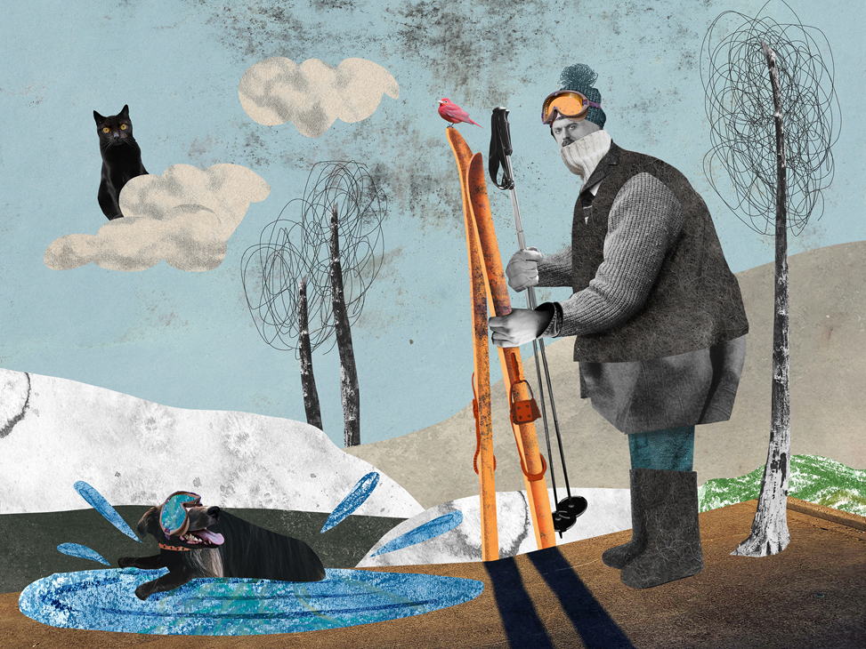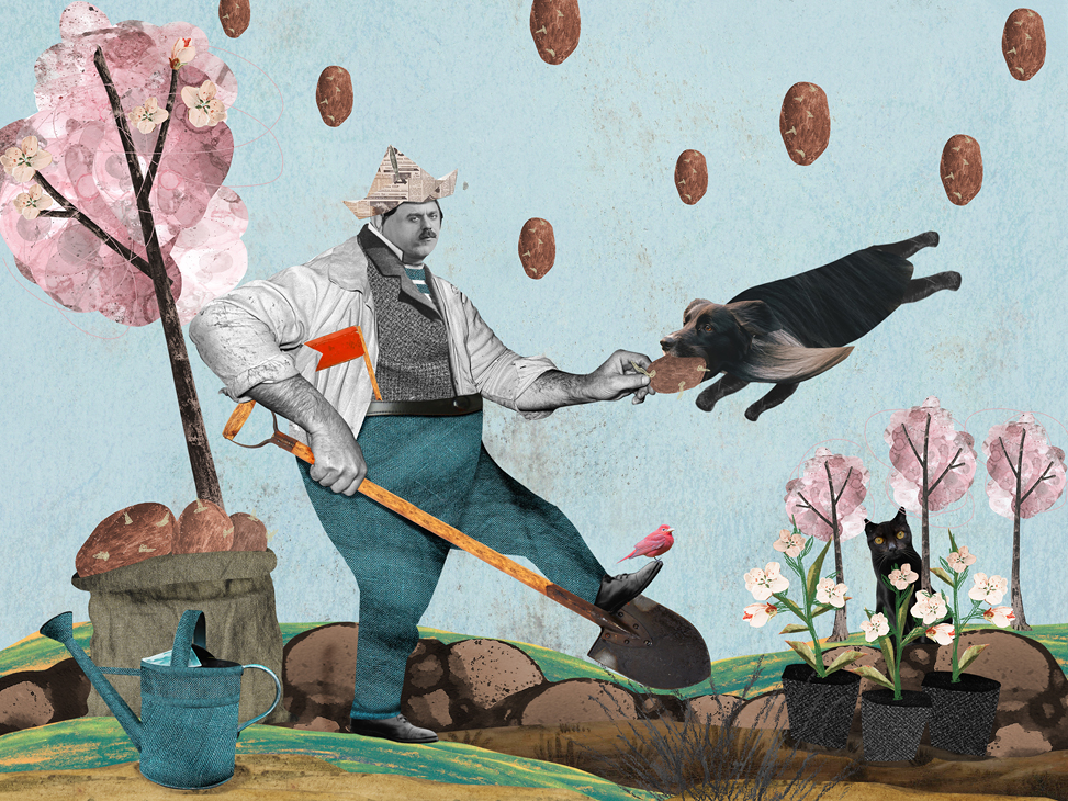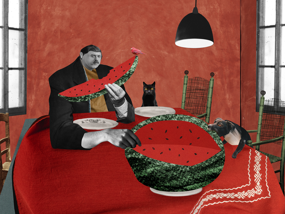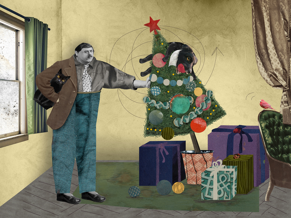 И вот однажды после очередной тяжёлой прогулки, потирая больное плечо и сматывая куски порванного поводка, у меня возникло безудержное желание поделиться своей болью. И я сделала первый коллаж. Это было в сентябре 2024 года. В октябре появился второй, в ноябре третий. В итоге каждый месяц я стала рассказывать какую-то историю из жизни своих питомцев – собаки Шелдона, кошки Хави и птички, которой у меня нет. Но не приврёшь – красиво не расскажешь.